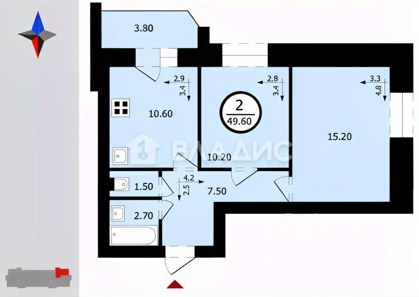 Общая площадь квартиры составляет 47,9 кв. м, из которых 25,4 кв. м — жилая площадь. Две изолированные комнаты (15,2 кв. м и 10,2 кв. м) идеально подойдут для комфортной жизни. Площадь кухни — 10,6 кв. м, что позволяет организовать пространство для приготовления пищи с удобством.