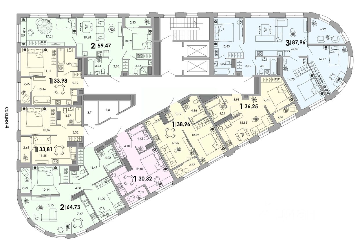 • Уникальные планировки с анфиладной или мастер-спальней, центральной кухней-гостиной, постирочной и гардеробной, а также с полукруглыми стенами и окном в ванной комнате.