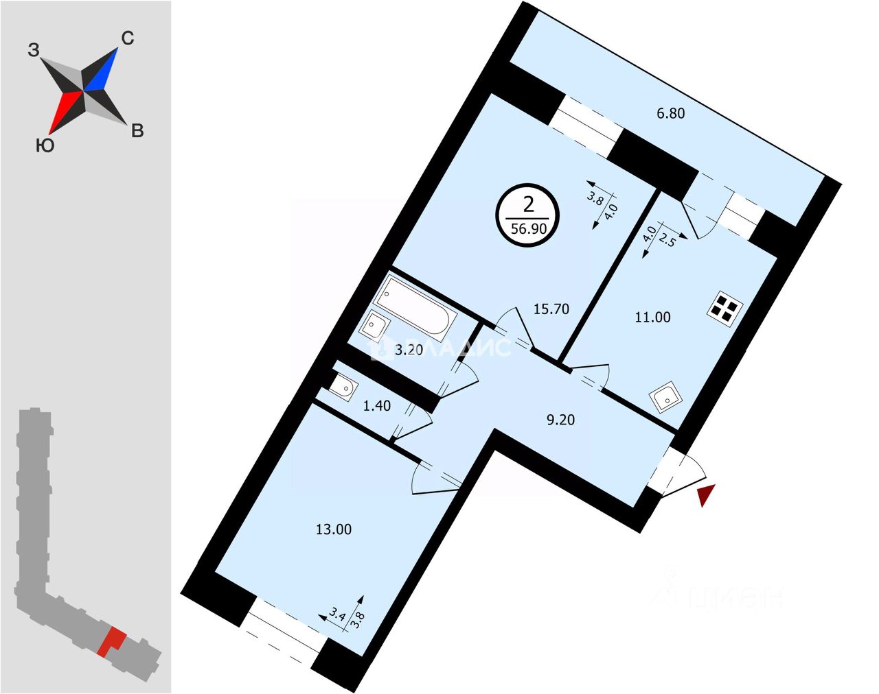 Квартира современной изолированной планировки кухня 11 кв.м., комнаты 15,7/13 кв.м., санузел раздельный, лоджия с кухни 6,8 кв.м., вместительная прихожая.