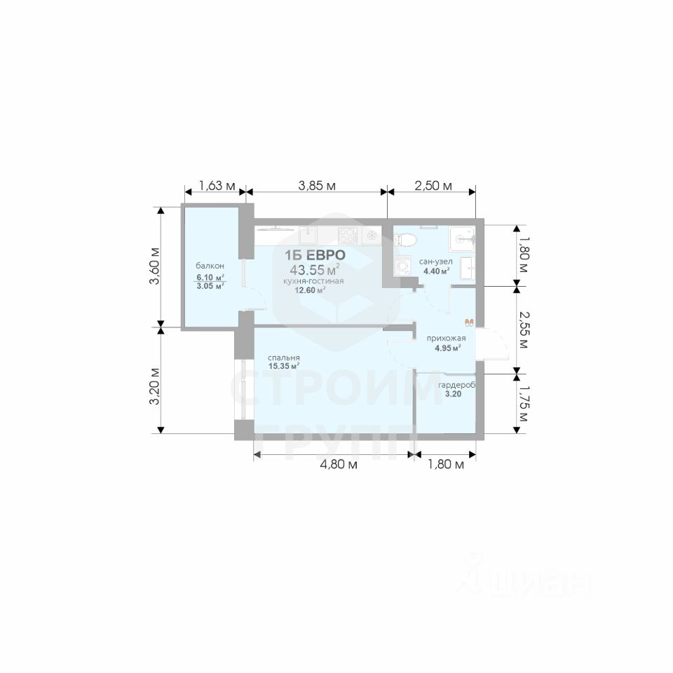 Общая площадь43,25 м²