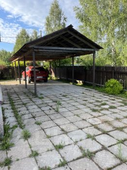 На участке имеется освещение, плиткой выложено пространство вокруг дома и крытая стоянка под два автомобиля.