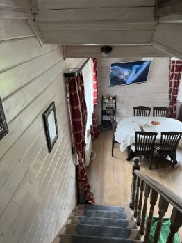 На втором этаже три спальни, зона отдыха, где можно почитать в уединении или посмотреть телевизор, тех.комната. На первом этаже кухня-гостиная, спальня и просторная туалетная комната. Есть кладовое помещение, оборудованное стеллажами.