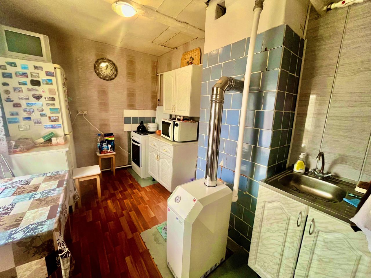 Планировка:прихожая,гостиная, комната, кухня,сан.узел совмещенный,Дом оборудован всеми коммуникациями: магистральный газ, электричество, центральная вода, канализация (септик), отопление от газового котла.