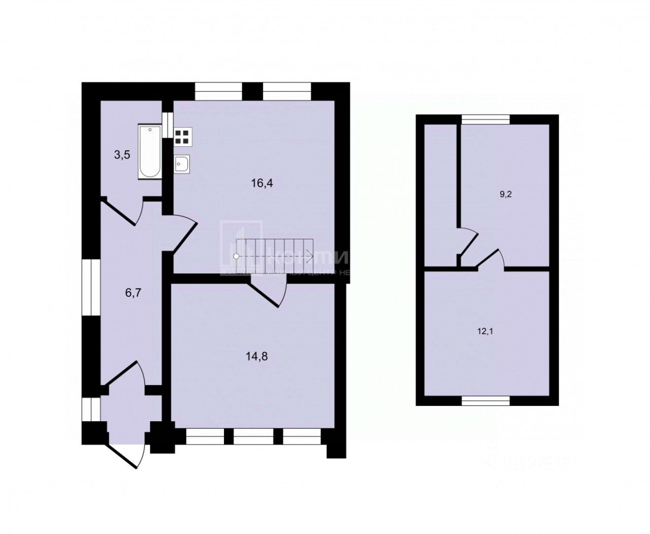 Комнаты - 16,4 + 9,2 + 12,1 кв м