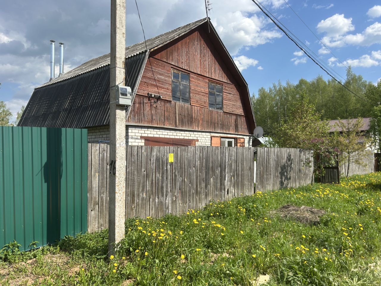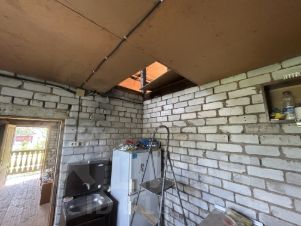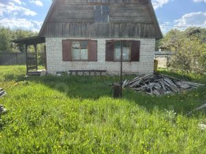 ЖИЛОЙ ДОМ: Дом двухэтажный, на ленточном фундаменте, размером 10 на 10 метров. Первый этаж кирпичный, второй этаж мансарда. Общая площадь с учетом всех помещений 65,7 кв.м. На первом этаже: при входе крыльцо, прихожая 6,5 кв. м., кухня 8,7 кв. м. и комната 21,5 кв.м. (комната обита внутри вагонкой, жили круглый год, два окна ПВХ). Второй этаж без отделки. Окна ПВХ в комнате на первом этаже и деревянные в остальных помещениях. Отопление разведено по первому этажу (кроме гаража). Дом 2002 года постройки.