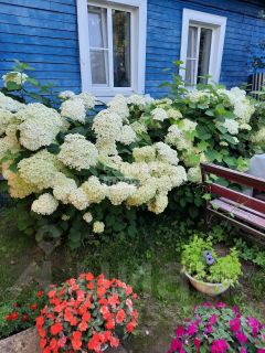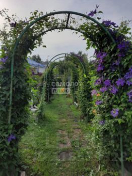 На участке много насаждений, цветов, яблони, груши, малины, грядки и т.д. Установлена теплица.
