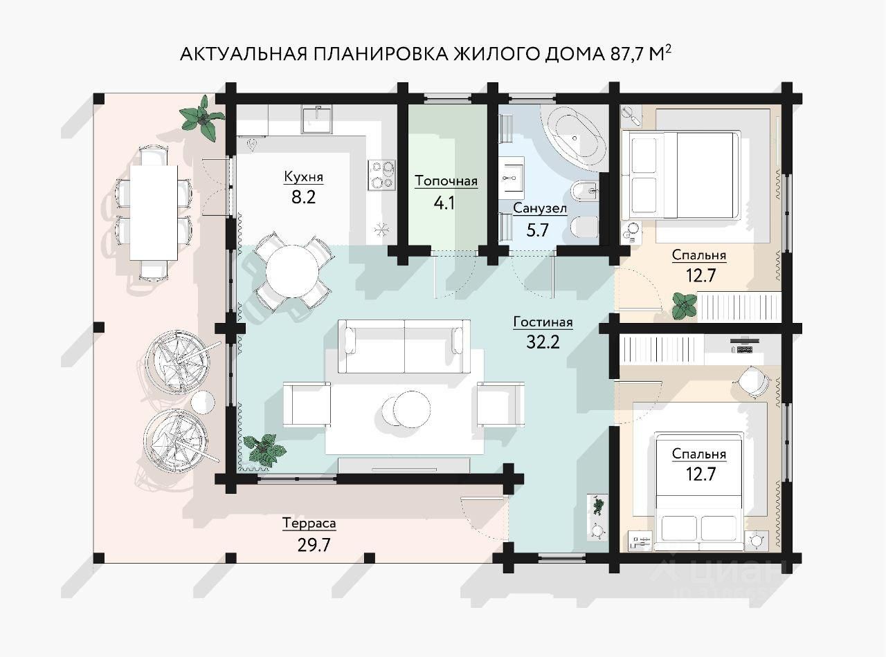 В доме расположены: кухня-гостиная с выходом на просторную террасу, санузел, две спальные и бойлерная.