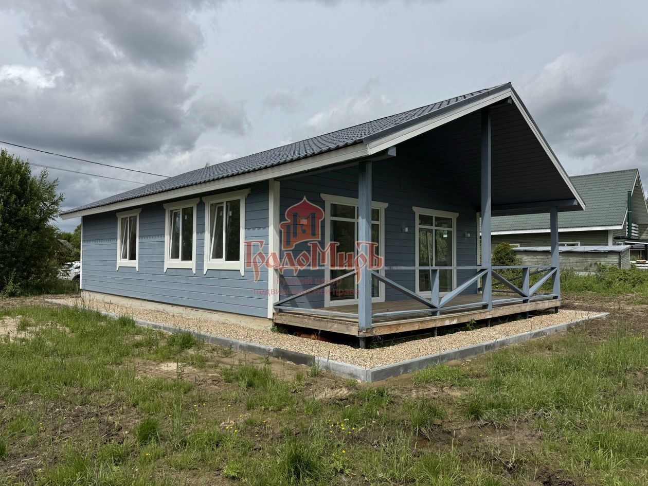 Планировка дома: прихожая, котельная, большая кухня-гостиная с панорамными окнами и выходом на террасу, три спальни, совмещенный санузел с готовым ремонтом.