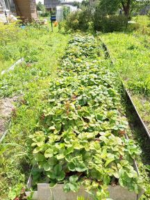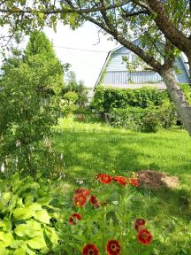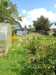 Очень много кустов плодоносящих, деревья, цветы , и конечно же грядки с клубникой и разной зеленью.