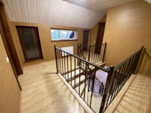 Второй этаж: одна комната из эмитации бруса . Другая комната из мдф панелей. Потолки евровагонка.