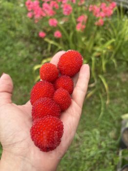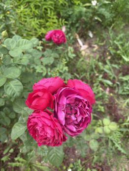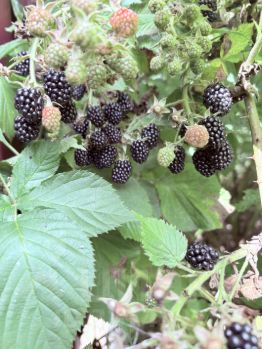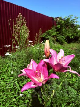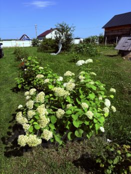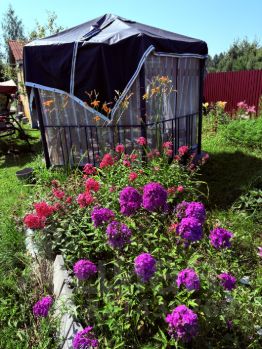 Огород: садовые и огородные плодоносящие культуры (яблони, смородина, крыжовник, малина, ежевика, клубника, тибетская малина), многолетние цветы.