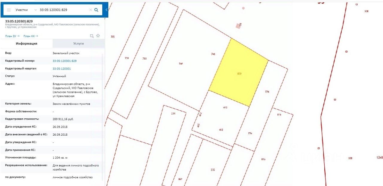 Кадастровый номер участка - 33:05:120301:829.