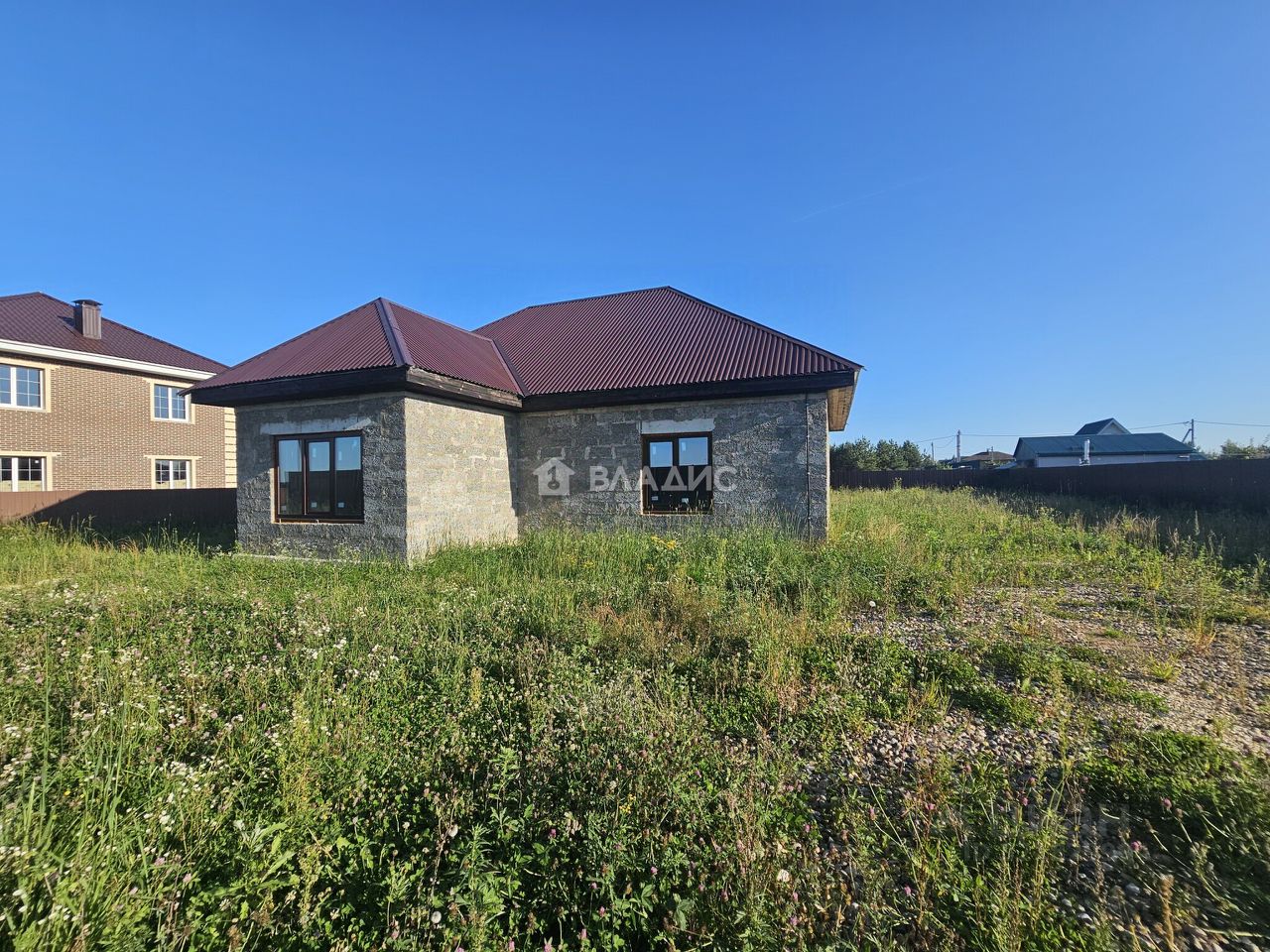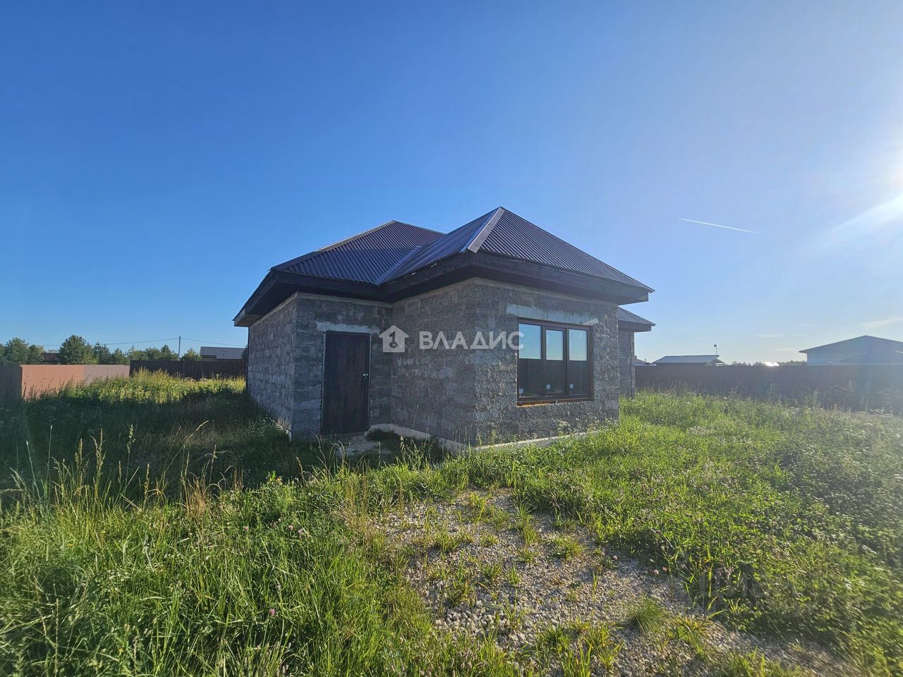 Отдельно подведены коммуникации: электричество, вода, канализация для места размещения бани или летней кухни. Внутри дома выполнена подготовка и шпаклевка стен, под штукатурку.