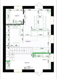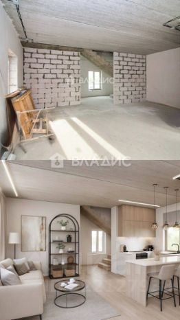 - Площадь просторной кухни-гостиной составляет почти 40 квадратных метров, высота потолков достигает трёх метров.