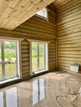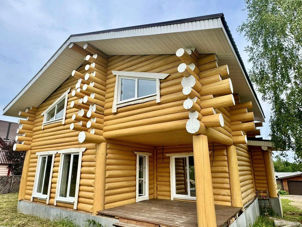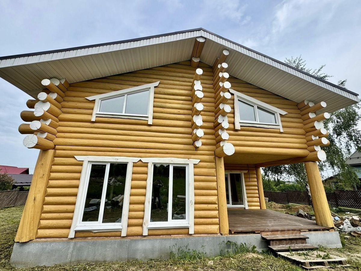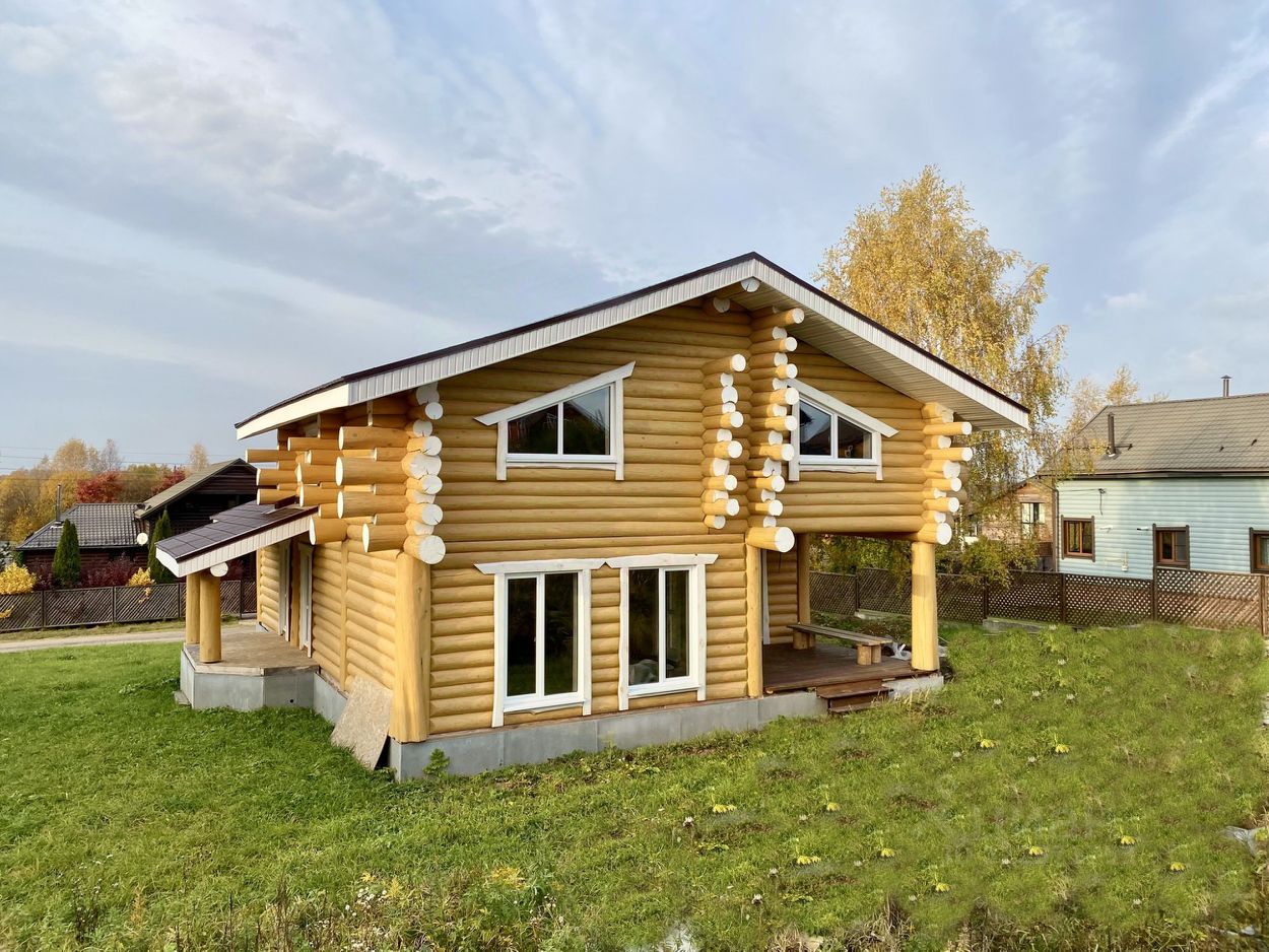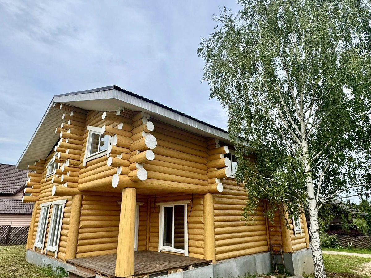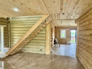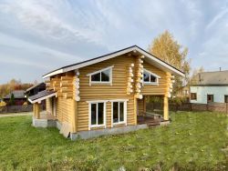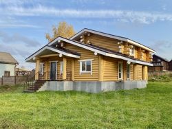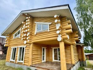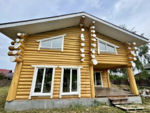 Дом двухэтажный общей площадью 186,9 кв.м. Построен из оцилиндрованного бревна. Дом стоит на бетонном фундаменте. Во всем в доме установлены современные окна ПВХ. При входе в доме сделан коридор-тамбур. Просторная кухня гостиная 66 кв.м. Первый этаж - теплый пол по всей площади дома, второй этаж - радиаторы. На первом этаже еще две комнаты, на втором этаже - две комнаты, Техническая комната (котельная-бойлерная) и совмещенный санузел с душевой кабиной. Из гостиной есть выход на открытую большую терассу и из каждой комнаты своя терасса.. На второй этаж ведет удобная лестница и так же сделан верхний свет, две комнаты и санузел. Дом очень теплый и экологичный.