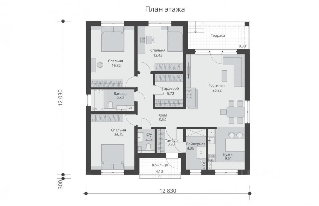 В доме 4 комнаты, 2 санузла, гостиная, совмещенная с кухней, кладовая, веранда.
