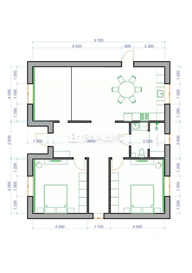 Дом 1-этажный, общая площадь - 101 кв.м.