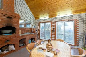 - летняя кухня (6х6) из кирпича с печкой и панорамными окнами в пол;
