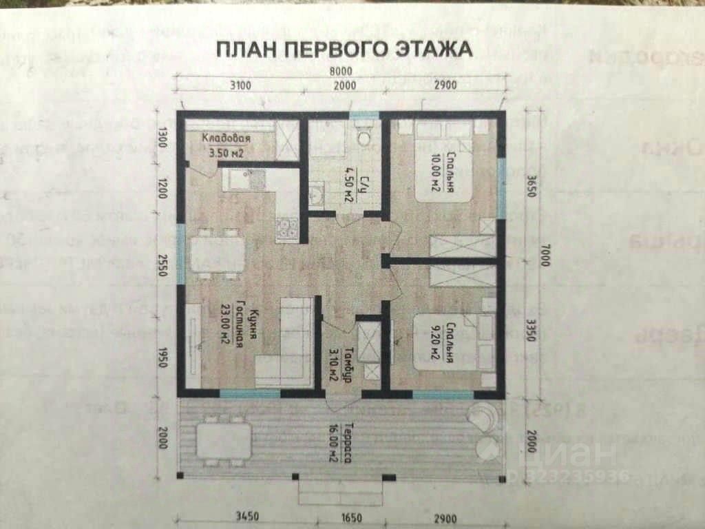 Первый этаж: большая терраса 16 м2. , прихожая-тамбур 3.1 м2. , большая кухня-гостиная 23 м2. , кладовка 3.5 м2., две спальни 9-10 м2 , холл 2.5 м2., совмещенный санузел 4.5 м2., душевая кабина, умывальник, унитаз, водонагреватель на 80 л.