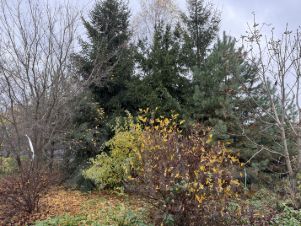 •	Растет много плодовых и хвойных деревьев, газон, цветы , тропинки вымощенные плиткой .