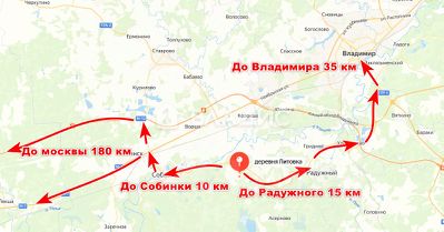 До Москвы 180 км, можно доехать по трассе М7 и М 12, до Владимира 35 км, до Радужного 15 км, до Собинки 10 км.
