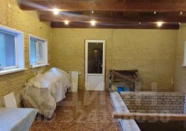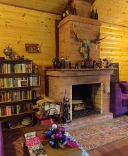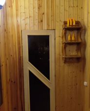На участке из пеноблоков на ж/б фундаменте построен садовый дом пл. 87,2 кв.м. с каминным залом. Он также утеплен и обшит блок хаусом. Полы монолитная ж/б плита, внутри керамическая плитка и ламинат. Сделана чаша для бассейна 2,2х4,9м, глубиной 2,5 метра. Парная требующая внутренней отделки. Санузел.
