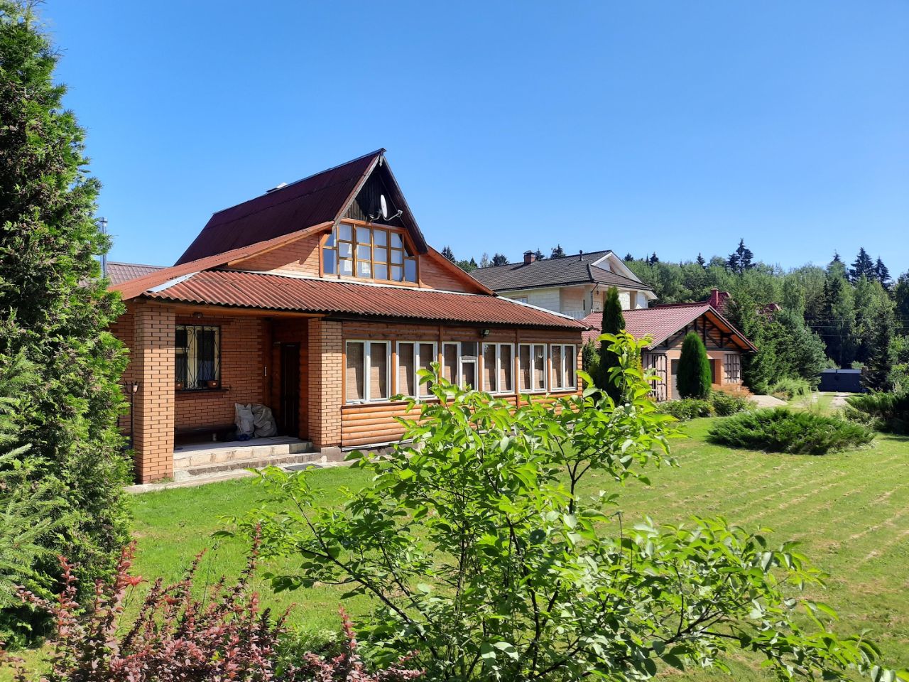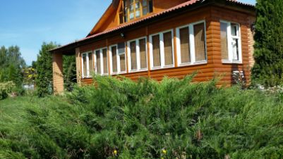 - участок полностью огорожен дорогим современным забором, освоен, благоустройство и газонное озеленение, дорожки из плитки, плодовые деревья и кустарники, туи, молодые ели и сосны, удобренные грядки под овощные культуры, парники, детская площадка, футбольная и волейбольная поляна, зимний естественный каток, спортивная площадка и т.п.