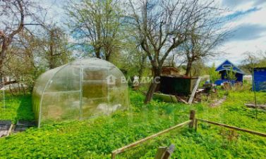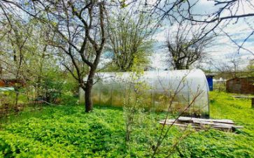 На участке не большой домик, новый хозяйственный блок для хранения инвентаря, теплица из поликарбоната, большой бак для воды.
