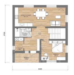 На 1 этаже расположено: Холл, Прихожая, Спальня, Кухня-гостиная, Котельная, Сан. Узел