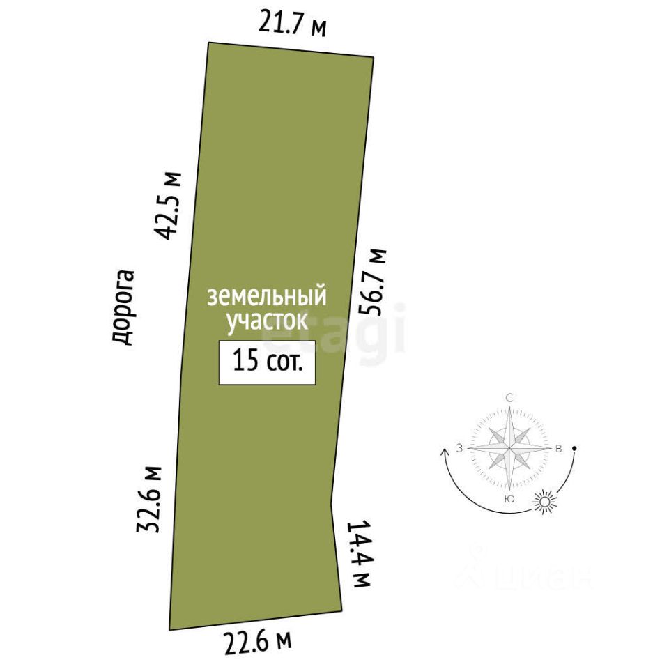 Участок 15 соток (ЛПХ), прямоугольной формы, ровный, сухой. Коммуникации: электричество — столб возле участка, газ — по границе участка(частично оплачено подключение).