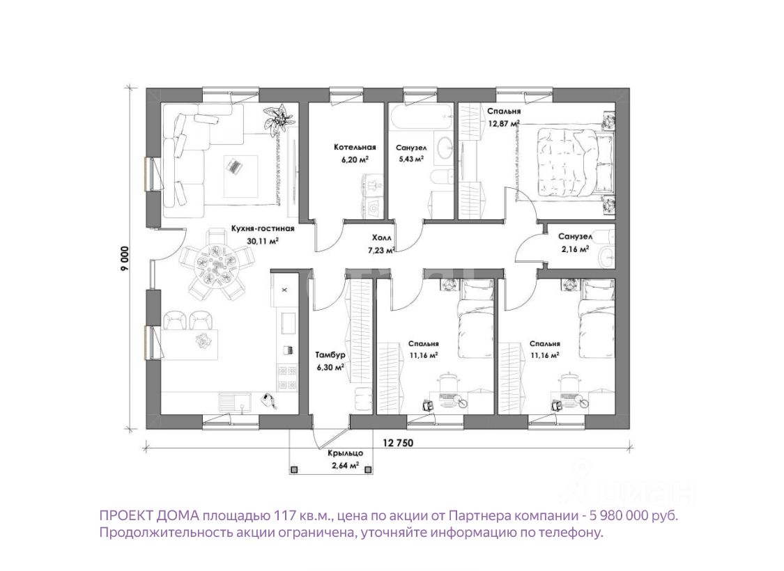 117 кв.м. (три спальни) за 5 980 000 рублей. Полное сопровождение строительства, денежные средства размещаются на эскроу-счете, дизайн-проект в подарок! Срок строительства 2-6 месяцев, гарантия на дом 50 лет!