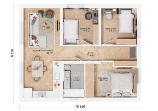 • Комнаты: 3, площадью 9,9-12,7-9,9 м2
