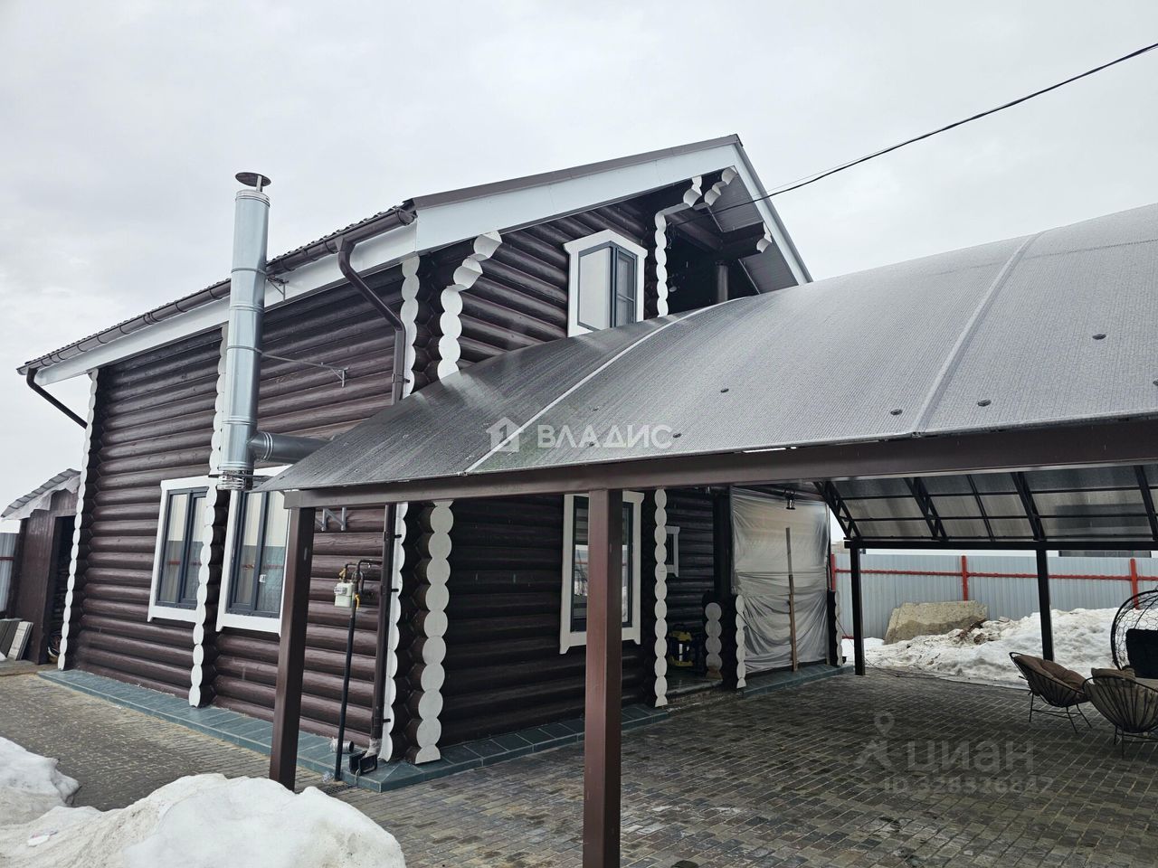 Дом построен из дерева - оцилиндрованного бревна, снаружи обработан, специальной краской.