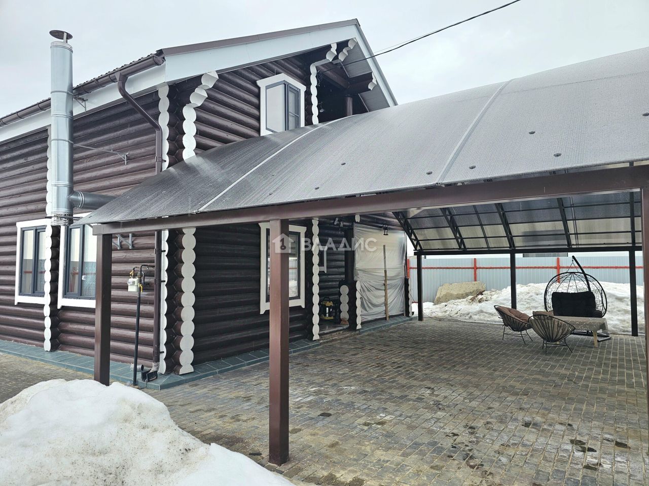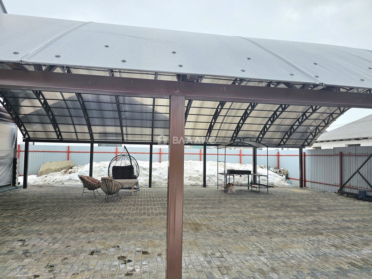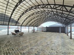 Перед домом выложена брусчатка, сделан большой навес для парковки и зоны барбекю, выполнено водоотведение с дренажной системой для ливневых вод, автоматические откатные ворота.