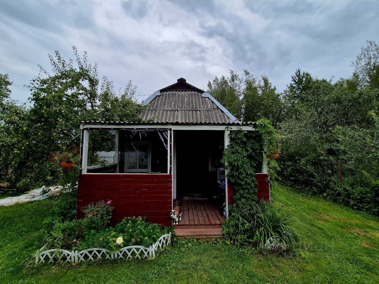 - На участке растут груша, яблоня, смородина, крыжовник, жимолость, клубника, малина и многообразные цветы.