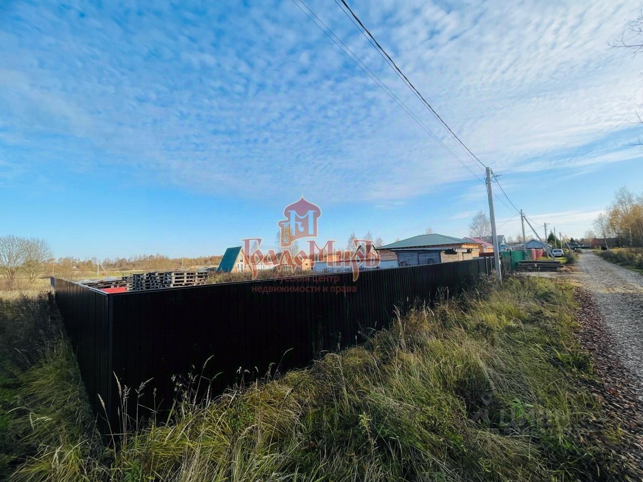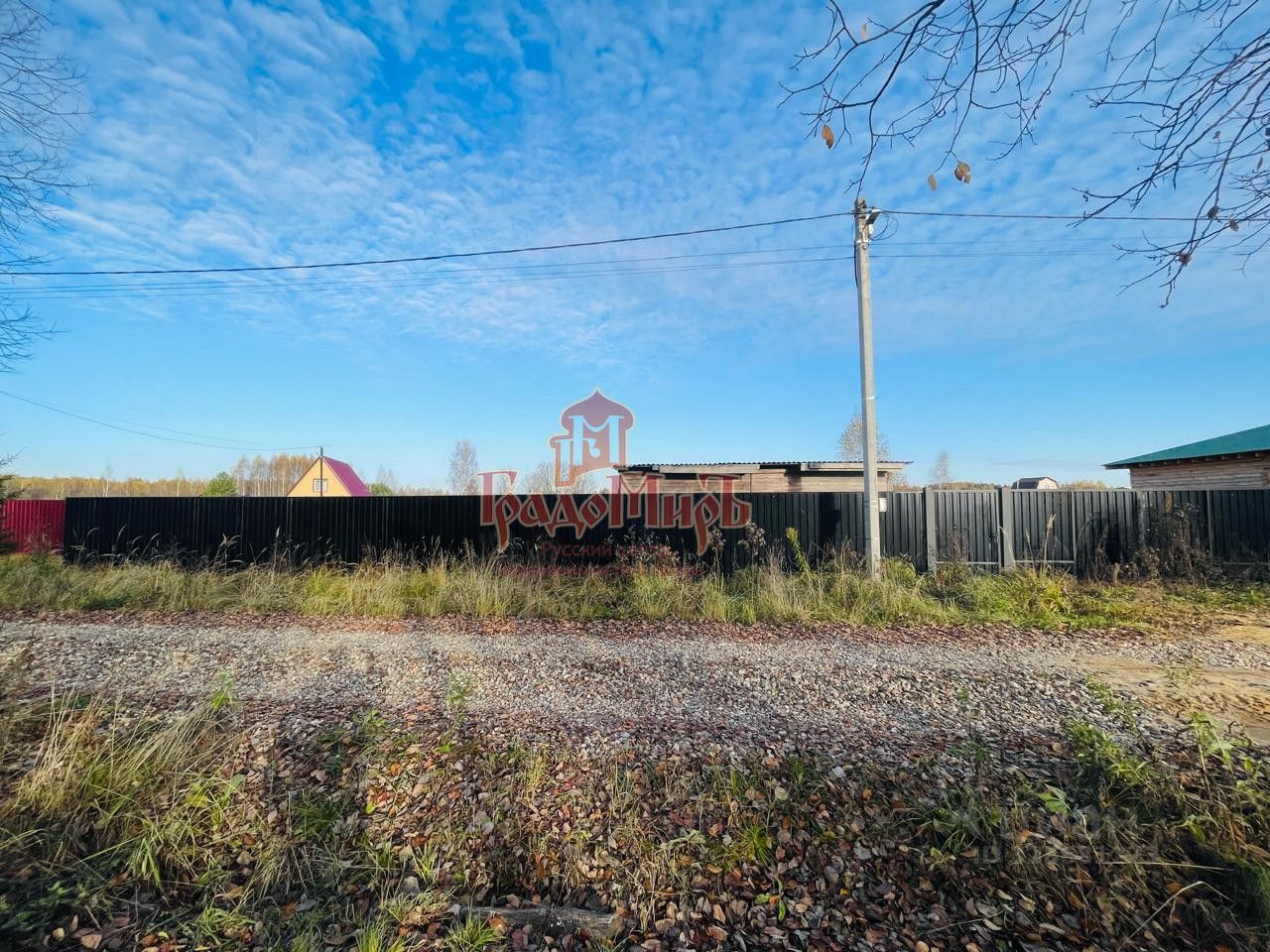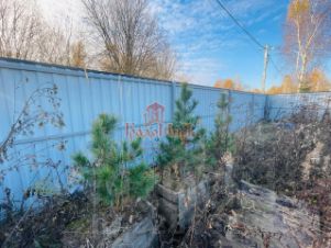 Земельный участок огорожен комбинированным забором. Часть забора, где планируется дом, огорожена металлическим профнастилом, а часть участка под сад и огород сеткой рабицей. Весь забор выполнен в одной цветовой гамме чёрного цвета.