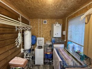 ХОЗ/БЛОК: Каркасный, утеплен минеральной ватой 100 мм., на свайном фундаменте, размером 7 на 3 метра. Состоит из террасы и одного помещения. Хоз/блок с отоплением от газового котла, установлены батареи.