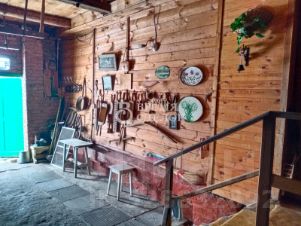 У дома большой кирпичный двор с дровяной баней, мастерской.