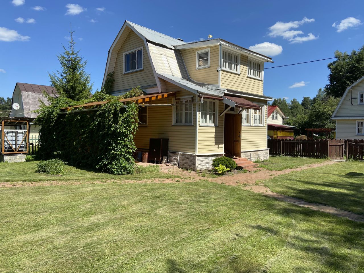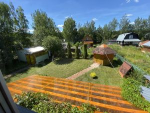 Дом на территории СНТ Олимпийский (территория огорожена с автоматическими воротами и домиком охраны на въезде), 2-х этажный. 1-й этаж сруб на ленточном фундаменте, 2-й этаж каркасно-щитовой, утеплен и обшит сайдингом, внутри вагонкой. Печка дровяная, кирпичная (пару раз встречали НГ - не замерзли, дом держит тепло хорошо). На участке в виде отдельного строения, сауна с душем и туалетом. (туалет и душ только в сауне в доме туалета нет). На 1-м этаже организована небольшая кухня с вытяжкой и привозным газом (баллон). Вода для бытовых нужд из скважины, поступает в накопительную емкость-куб (обезжелезивание и фильтрация) затем через насосную станцию в дом и баню. Вода для питья и приготовления пищи ПРИВОЗНАЯ! Так же на территории есть беседка крытая с мангальной зоной, турник, брусья, баскетбольное кольцо и небольшой крытый навес под качели. Из ботаники: 3 больших туи, яблоня, газон и еще какая то мелкая растительность. Из зоологии: иногда одолевают кроты ) (портят газон). СНТ находится недалеко (не напрягает экологией и шумом) от трассы, в 10 мин езды населенный пункт п.Вольгинский с магазинами и всеми остальными хотелками.