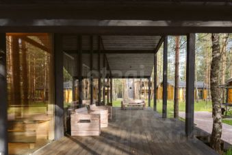 Финская сауна с панорамной стеклянной стеной позволяет наслаждаться природой прямо во время отдыха. После парной можно выйти на меблированную террасу и устроить уютный вечер в зоне барбекю.