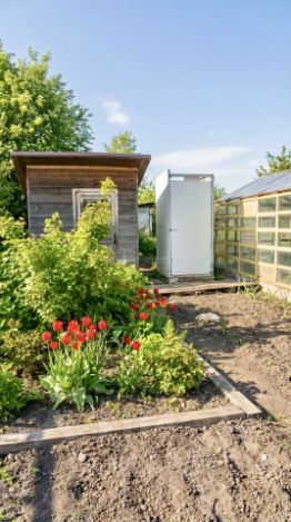 Готовая инфраструктура: новый сарай для инвентаря, теплицы, организованное парковочное место на участке.