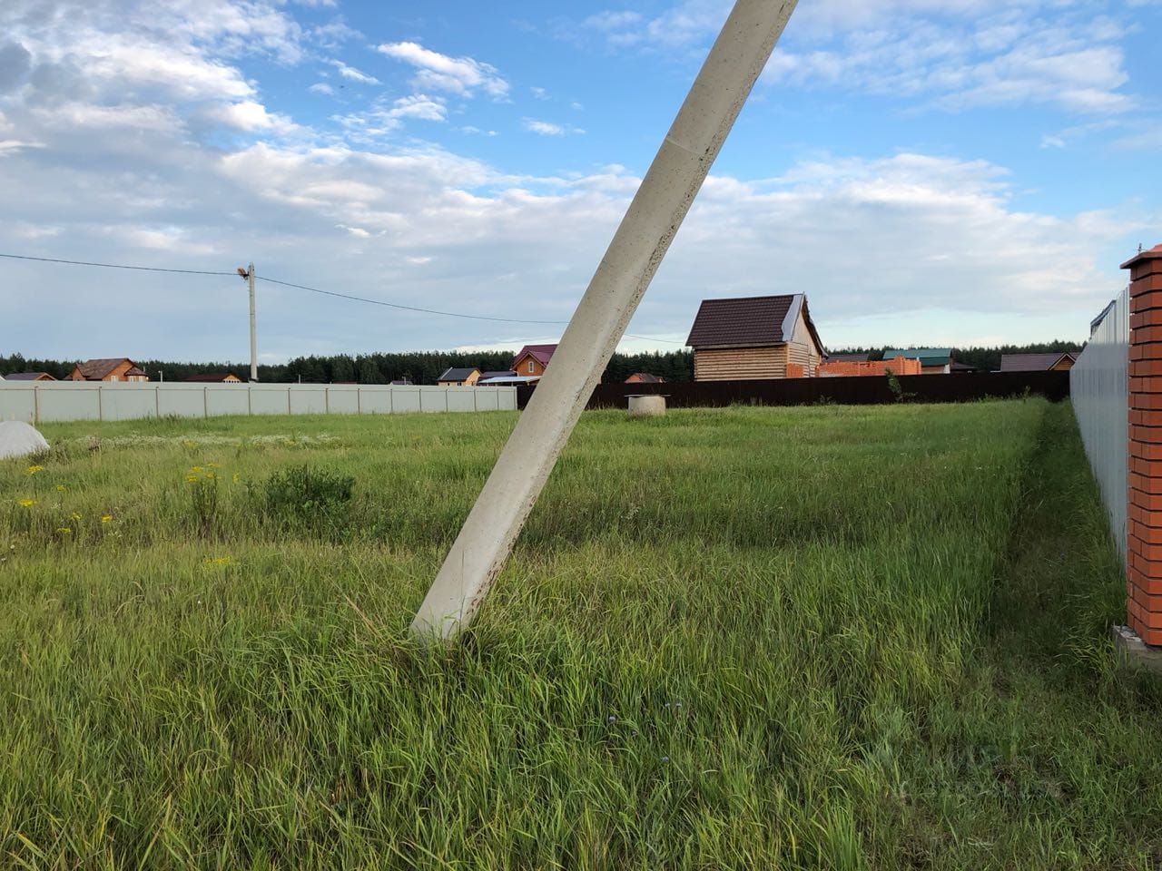 На участке есть свет и вода . С трех сторон огорожен забором . Есть кусты смородины и пара плодовых деревьев .