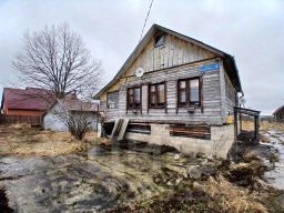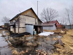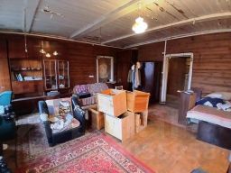 Одноэтажный дом размером 6x9 м., бревно, на ленточном фундаменте, цоколь поднят с бетонных блоков на 1.2 м.. С внешней стороны стены обшиты вагонкой , внутренние стены оставлены бревно . Полы - доска толщиной 50 мм. Двухскатная кровля покрыта шифером . Входная дверь деревянная, окна деревянные ( двойные ).