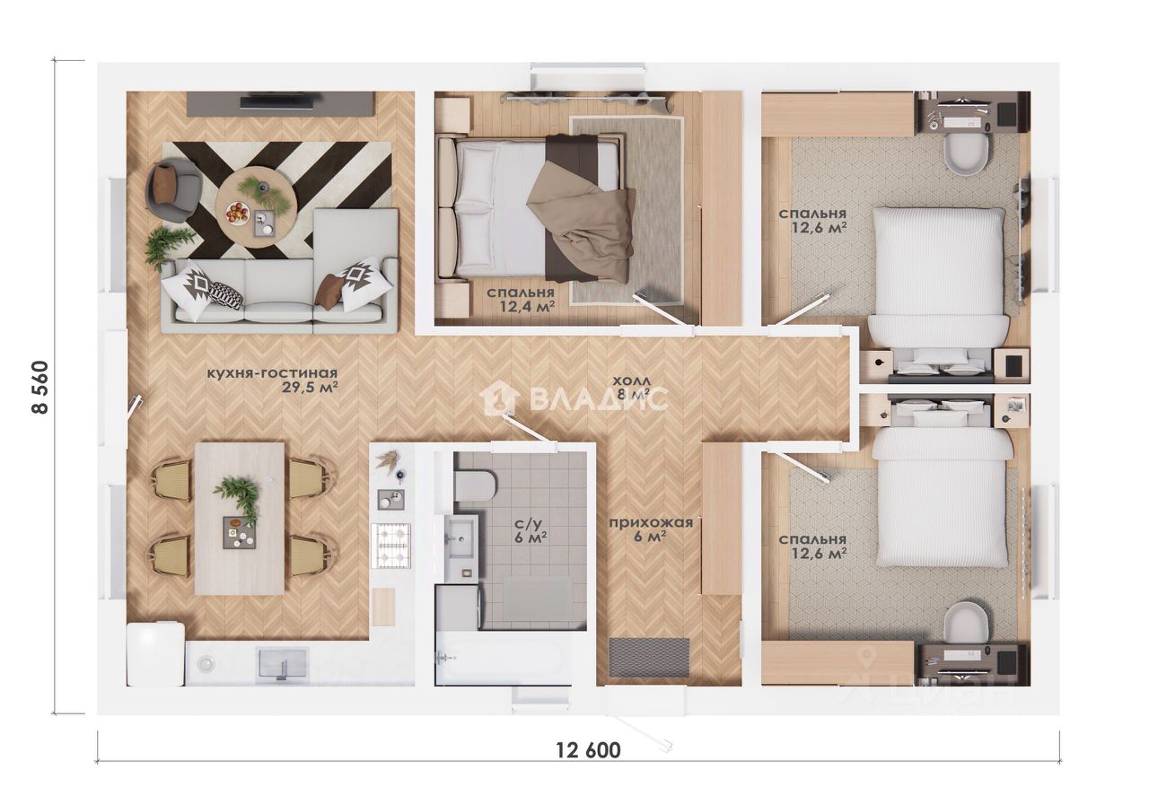 3 просторные комнаты, жилая площадь 37,6 м² — для семьи с комфортом!