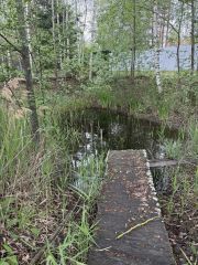 На участке: пруд прямо при въезде. Мы его когда-то с папой чистили, запускали карасей. Сейчас он немного зарос, но сидеть рядом, смотреть на воду и слушать тишину — лучше любого спа-салона. Деревья высоченные — ели, березы. В тени даже в июле прохладно.