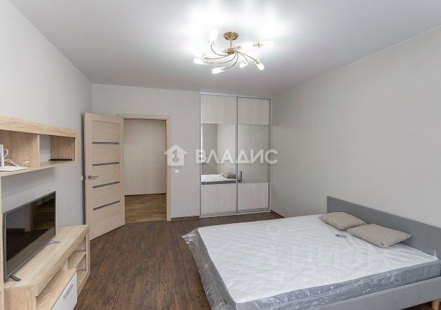 В комнате новая двуспальная кровать с новым матрасом, стенка и телевизор.